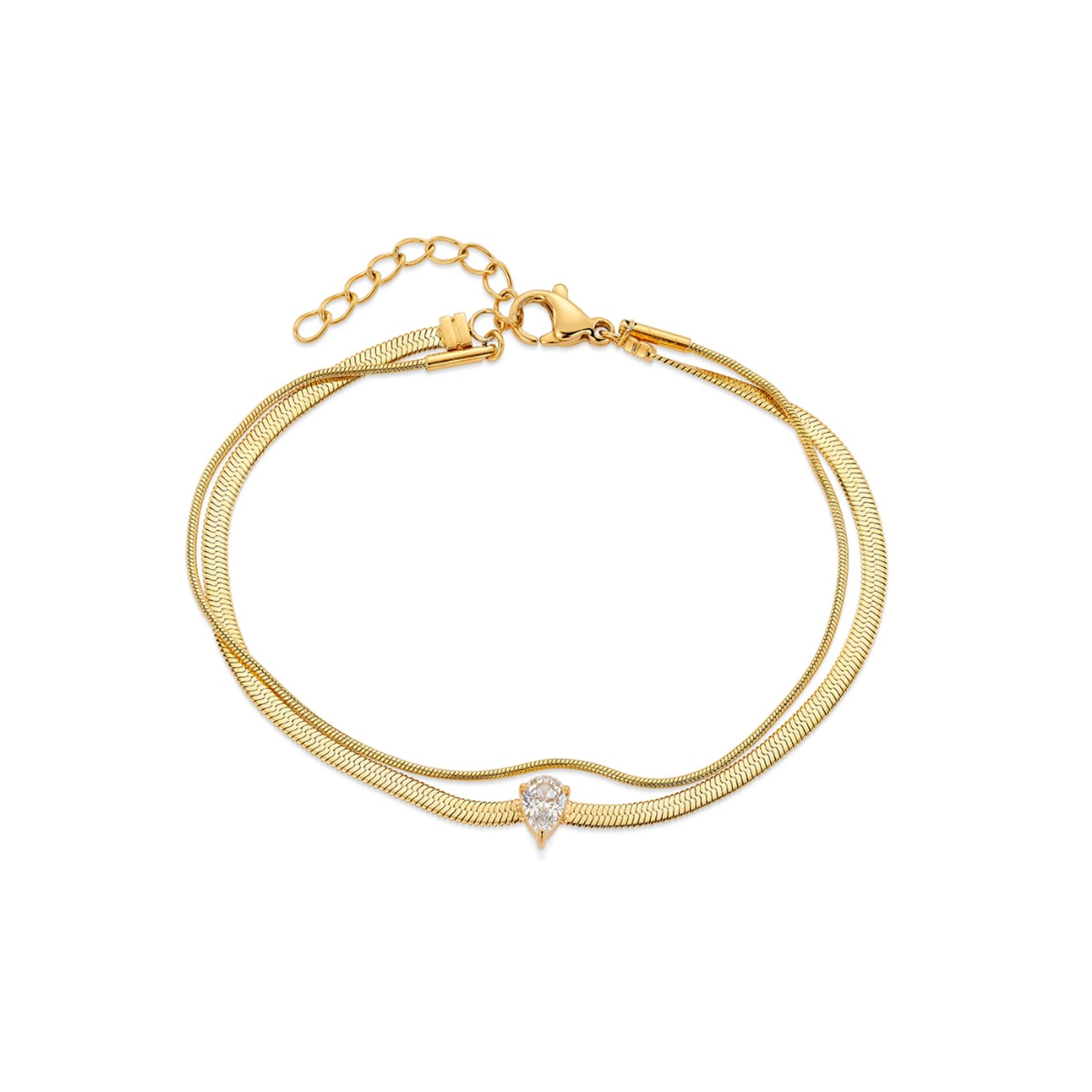 LINEA er et trendy armbånd fra By Olea Stål-kolleksjon. Her er det to kjeder som er hektet sammen og som gir dette smykket denne kule layering stilen. Det ene kjedet har et anheng med dråpeformet hvit sten. Det andre er et slangekjede uten anheng. Lengden er også justerbar som gjør at det kan passe de fleste håndledd. Lengde 17,5 cm + 3 cm.
